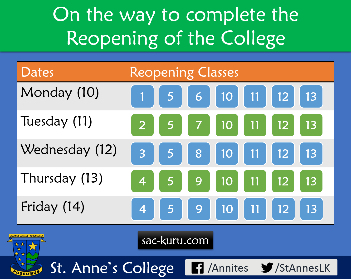 This week, the classes are opening as follows in our pursuit to reopen the College completely.