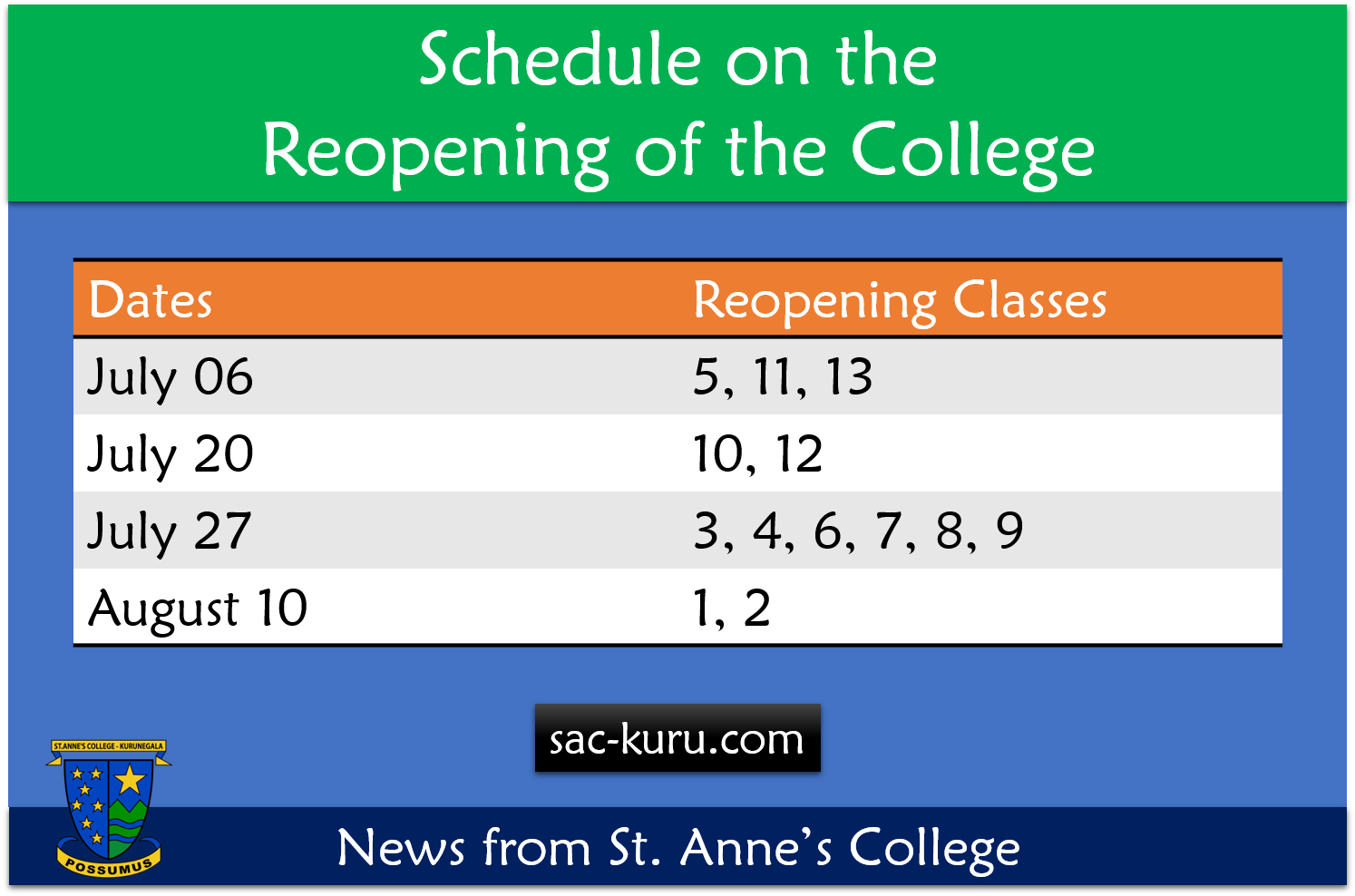 The College holiday will end on the 29th of June and it will re-open under 04 separate stages. This will also be true for other Colleges and Schools in the country.