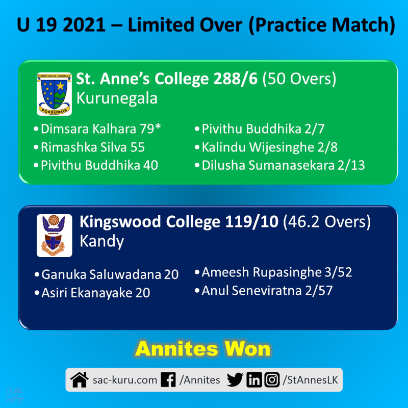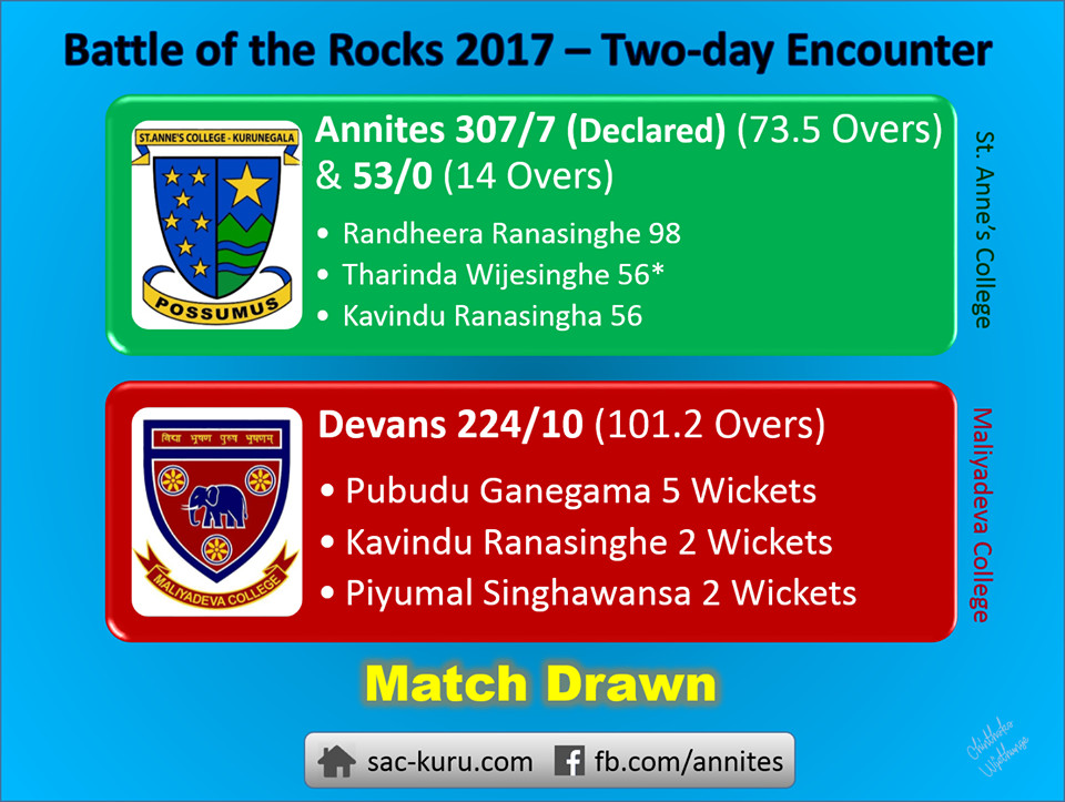 We congratulate both St. Anne's College and Maliyadeva College for their part in this game that ended in a spirited draw and look forward to the exciting One Day Encounter tomorrow.— St. Anne's College (@StAnnesLK)