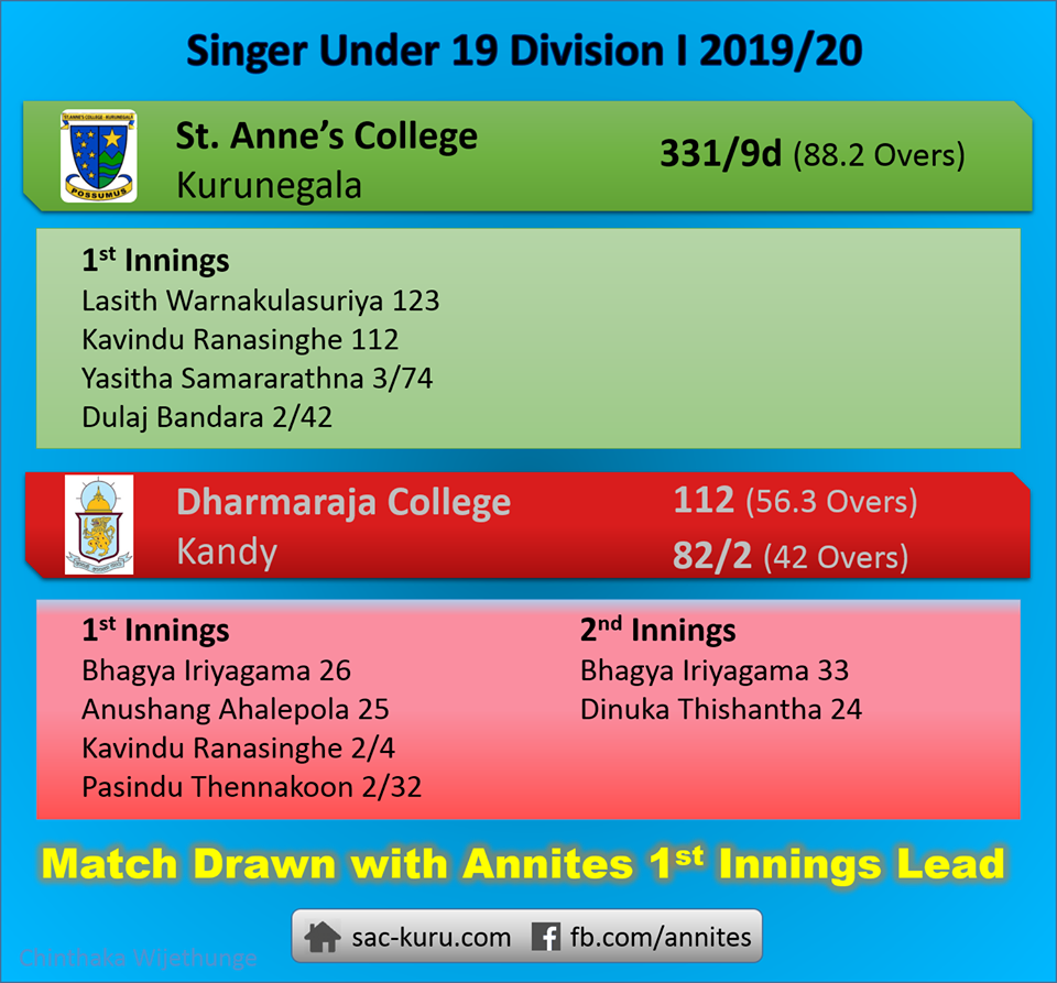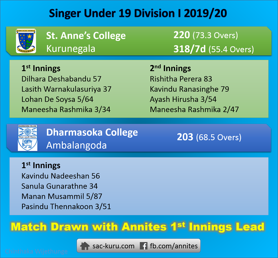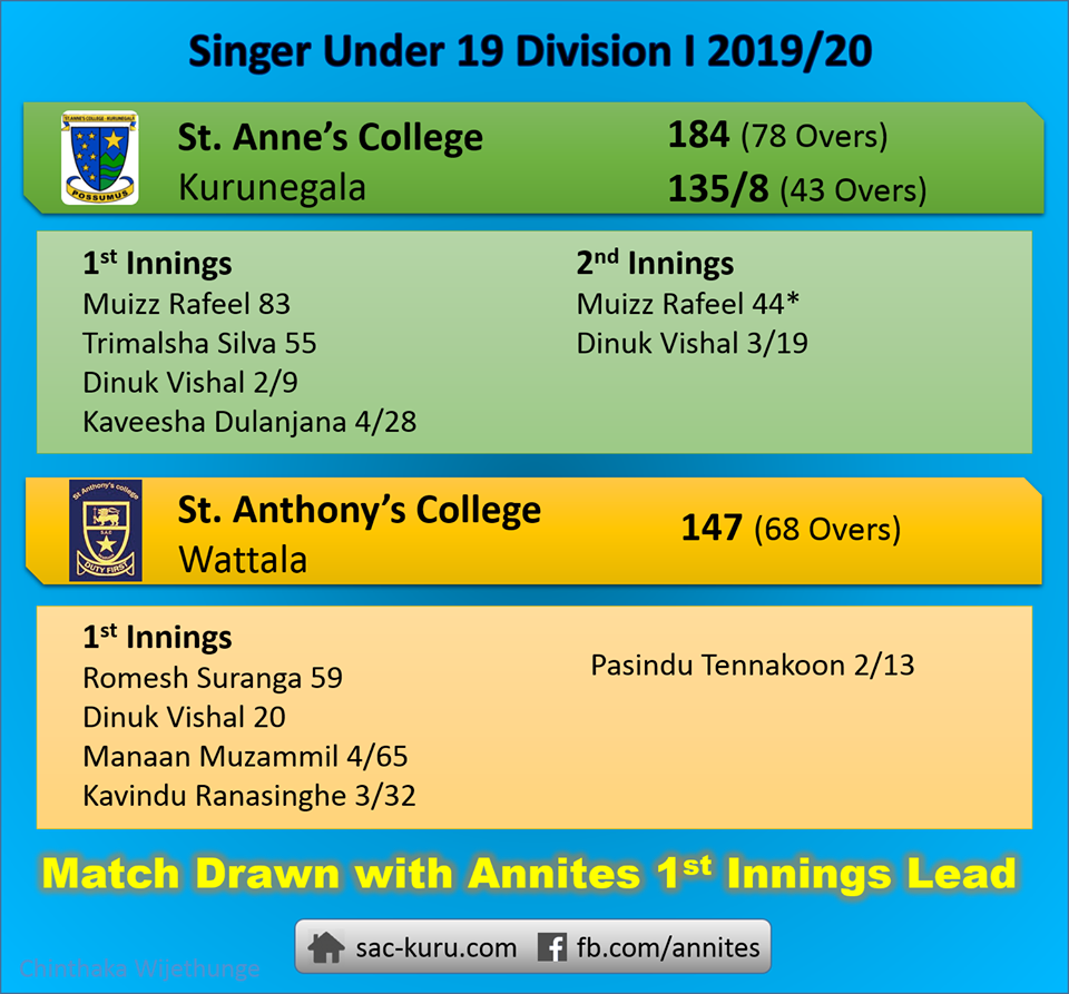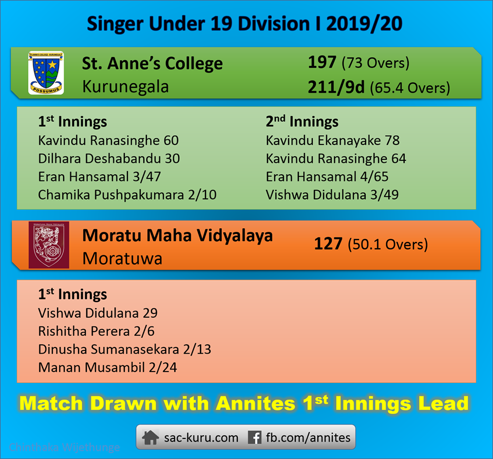 St. Thomas College, Matara in response to St. Anne's College's first innings score of 300/9(declared) fell behind managing to score only 158 and 107/6 in the first and second innings respectively.