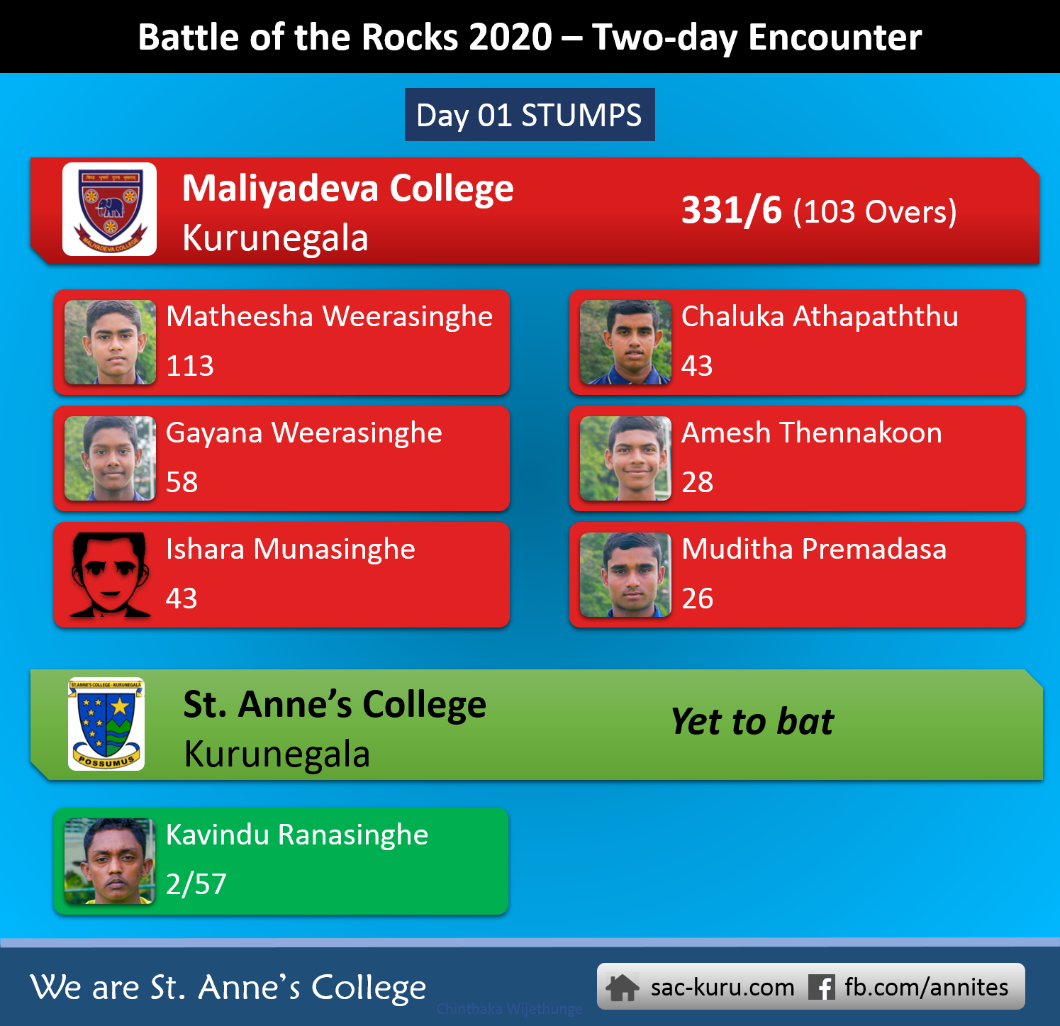 St. Anne's College bowled out St. Joseph Vaz Team for 218 in the 1st innings. Annites then amassed a total of 358 on the strength of a top-notch century by Mahima Kotuwila and contributions from his teammates. Chamith Sasenjana and Adithya Nirvan were two other Annites who passed fifties. Mahima made 115 in his innings while Chamith fell 14 runs short of his century.