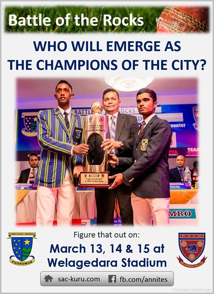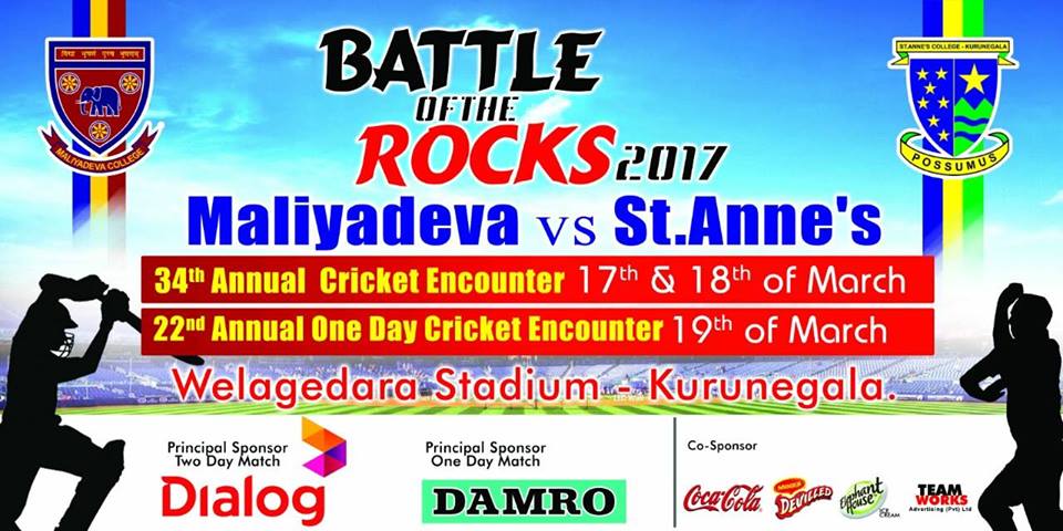 32nd Battle of the Rocks - Two-Day Encounter between Maliyadeva College and St. Anne's College will be played at the Welagedara Stadium on March 13 and 14. Play will commence at 10.00 a.m. on both days.
