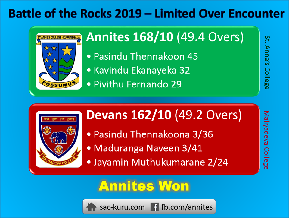 St. Anne’s College bested Maliyadeva College by 33 runs in the 23rd ‘Battle of the Rocks’ limited overs cricket encounter played at the Welagedara stadium Kurunegala yesterday.
