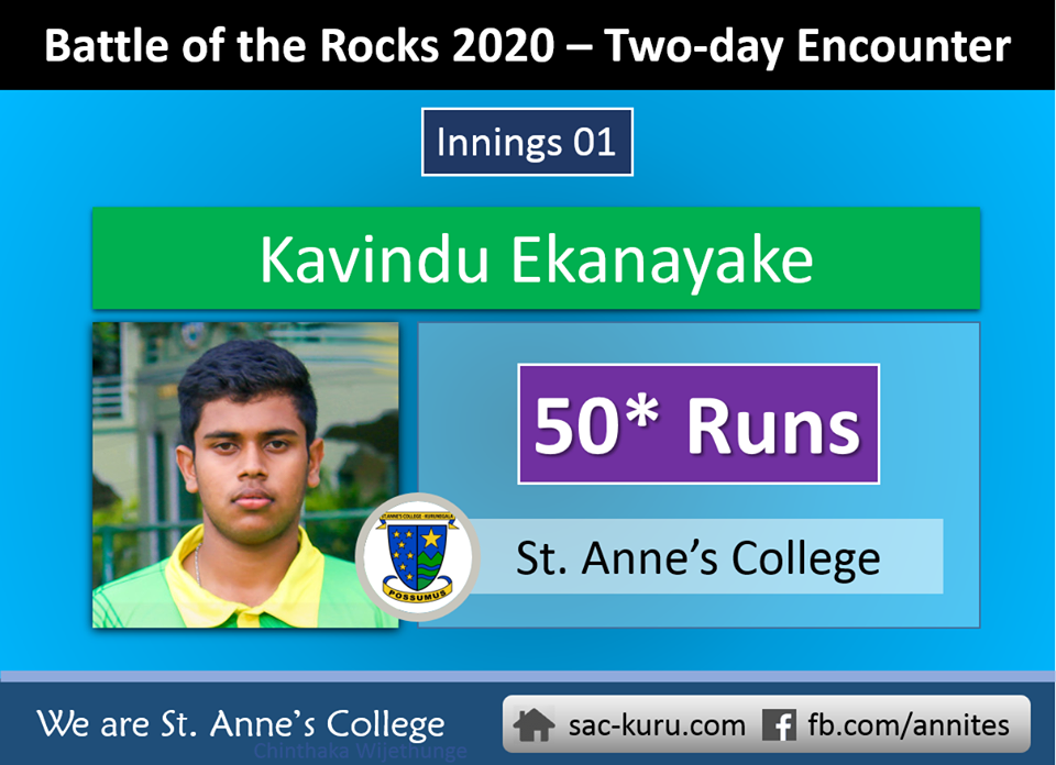 St. Anne’s:207 in 48.5 overs (Kavindu Ranasinghe 54, Wanitha Wanninayake 44, Dineth Chandimal 31, Randeera Ransinghe 21, Naveen Madhuranga 3/22, Nishanjaya Hettiarachchi 2/14, Pasindu Thennakoon 2/34)