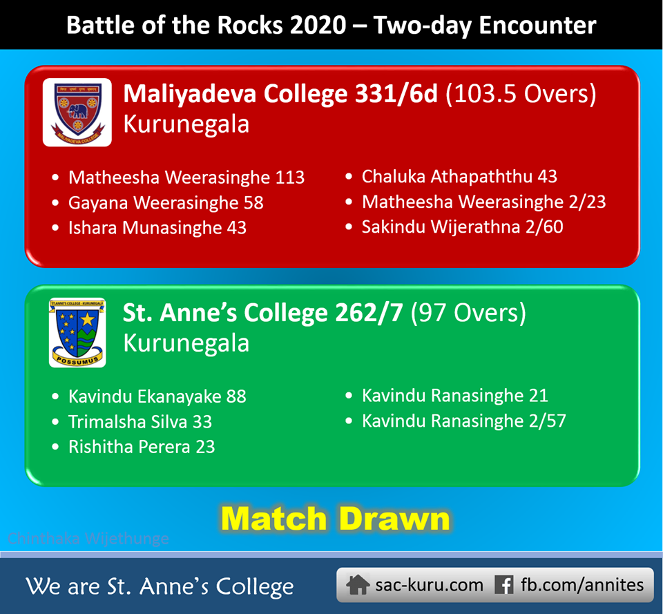 We congratulate both St. Anne's College and Maliyadeva College for their part in this game that ended in a spirited draw and look forward to the exciting One Day Encounter tomorrow.— St. Anne's College (@StAnnesLK)