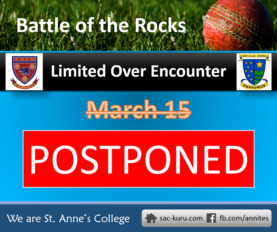 Battle of the Rocks 2020 Limited Over Encounter between Devans and Annites which was scheduled to be held on tomorrow has been postponed until further notice.