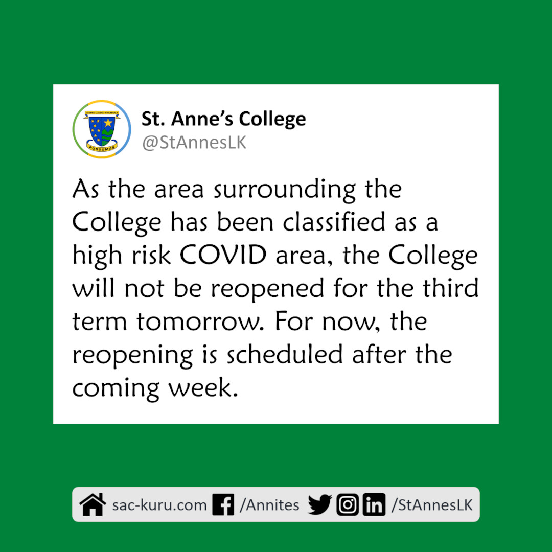 Due to the prevailing COVID situation, there will be no reopening of the College tomorrow. We ask our dear students to stay safe in their homes without taking the risk of exposing to the deadly virus.